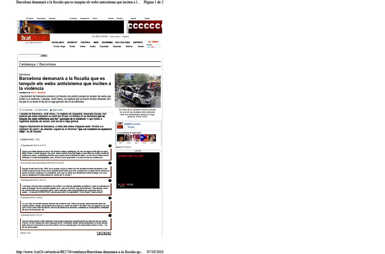 En su Tele, mejor dicho en la TV3 de la Generalitat, y supongo que también en la suya TB (cada reyezuelo o reino de Taifa monta su TV con dinero público) ha declarado con esa gravedad que le caracteriza: “El Ayuntamiento de Barcelona enviará a la Fiscalía una petición para que se cierren las webs que incitan a la violencia…”, y en el catalán del “bon cop de falç…” que con tanto fervor entonan con el puño cerrado.