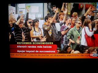 La Tele los califica de “indignats” “indignados”, pero el aviso a los políticos va más allá de la indignación; “desnunaments (desahucios) judiciales asociació”, ”no es la crisis es el sistema”, “vivimos todos atrapados en su mentira”, “políticos sois el problema en el país”, “antisistemas por supuesto” “banca a la merda”…